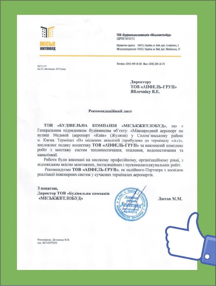 Отримали рекомендаційний лист від ТОВ "Міськжитлобуд", об'єкт Міжнародний аеропорт "Київ" (Жуляни) Приємно, що так високо оцінюєте нашу роботу!